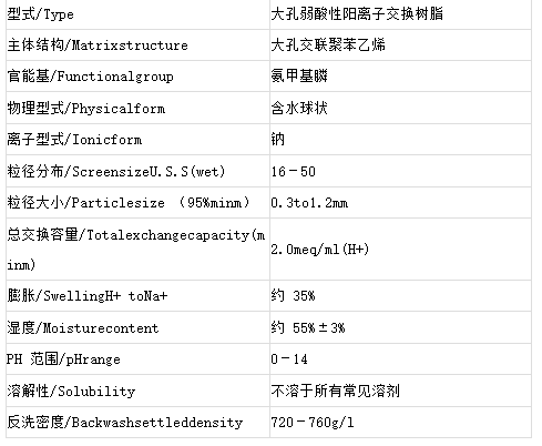 CH-93是包含氨甲膦酸基連接到聚苯乙烯共聚物的一種極耐用的大孔樹(shù)脂,是一種專(zhuān)門(mén)用于高鹽水除鈣鎂螯合樹(shù)脂。它從含有一價(jià)陽(yáng)離子的廢水處理中選擇性的除去二價(jià)金屬陽(yáng)離子。使二價(jià)金屬陽(yáng)離子以及由其他二價(jià)陽(yáng)離子可以像鈣一樣容易地從一價(jià)陽(yáng)離子中分離出來(lái)。