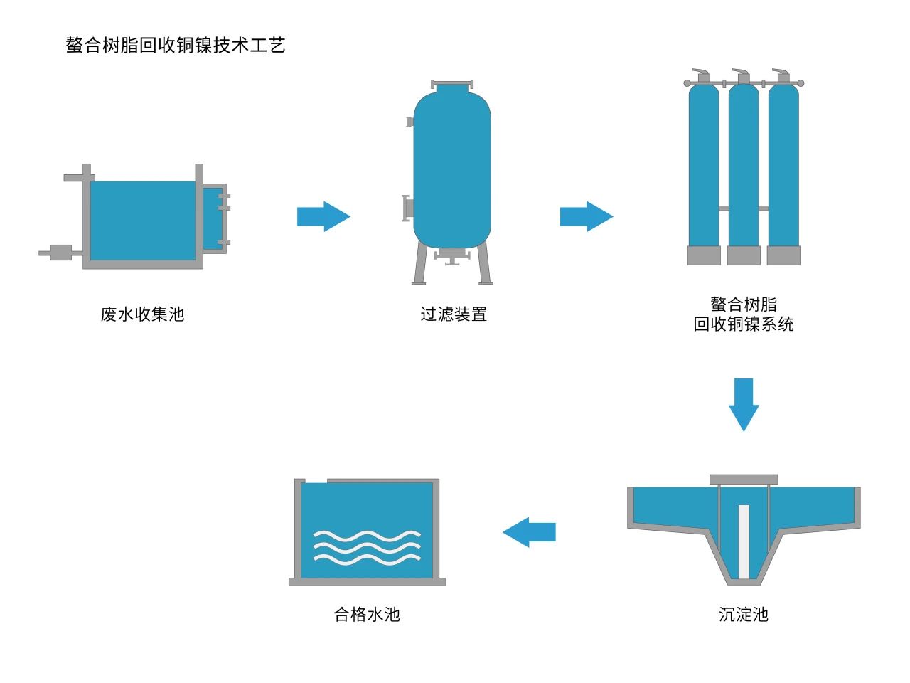 傳統沉淀法不能滿(mǎn)足日益提的環(huán)保要求(如電鍍表三鎳含量要求0.1mg/l以下)。針對特定重金屬離子的特點(diǎn),利用螯合樹(shù)脂的特種功能基團與重金屬離子形成絡(luò )合物的特性,實(shí)現重金屬離子的回收利用及深度去除。