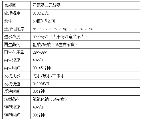 與此同時(shí),CH-90除銅鎳等具有特定的選擇性,尤其在鎳離子及絡(luò )合態(tài)鎳(檸檬酸、醋酸、蘋(píng)果酸、酒石酸、琥珀酸、羥基乙酸等,以及鋅鎳合金、鎳銨絡(luò )合物等)的處理方面有強的結合作用和應用優(yōu)勢,適合在酸性環(huán)境(pH值3左右)下直接對鎳吸附。對于強絡(luò )合鎳,需要先破絡(luò )再除鎳(如EDTA鎳),飽和吸附量大約在50g/l。