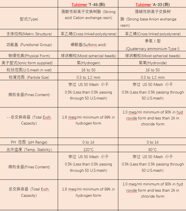 Tulsimer? T-42 和 Tulsimer? A-23 其均勻的顆粒直徑,能取代傳統的離子交換樹(shù)脂,并可以減少壓力損,可以一起搭配使用于2B3T及超純水可再生的混床。