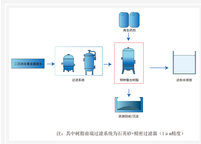 以重金屬廢水為例,針對特定重金屬離子的特點(diǎn),科海思工業(yè)廢水處理解決方案,利用螯合樹(shù)脂(CH-90Na)的特種功能基團與重金屬離子形成絡(luò )合物的特性,從而實(shí)現重金屬離子的回收利用及深度去除。