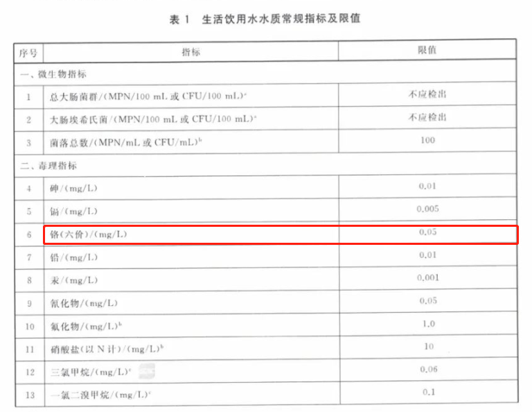 鉻在水中主要以三價(jià)和六價(jià)形式存在,三價(jià)的鉻是對人體有益的元素,而六價(jià)鉻是有毒的。由于其毒性之高,已被國家列入有毒有害水污染物名錄。人體長(cháng)期飲用含有六價(jià)鉻的水,六價(jià)鉻離子就會(huì )在體內蓄積,對消化系統造成危害,影響正常的生理代謝,甚至會(huì )對肝臟、腎臟等重要器官造成損傷,形成不可逆的傷害。2023年4月1日正式實(shí)施的《生活飲用水衛生標準》(GB5749-2022)中規定了生活飲用水中的六價(jià)鉻限值為0.05mg/L。